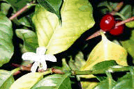 コーヒー豆は、コーヒーの木(アカネ科の植物)の種子です。 コーヒーの木は、苗木が成長して2〜3年でジャスミンのような香りのする白い花が咲くようになる。 この花は開花して2,3日でしぼんでしまいますが、やがて楕円形の実をつける。 完熟すると赤くなりサクランボに似ているところから「コーヒーチェリー」と呼ばれている。